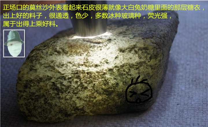 那么赌石当中有些非常著名的场口,也就是产地,比如莫丝沙,黑乌沙,大马坎,白岩沙等等插口,这些都是著名的老厂。每个场口都有着自己的特点,